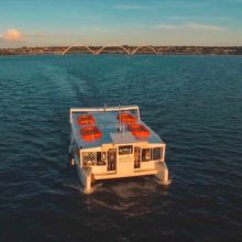 Embarcação modelo Catamarã, própria para operações turísticas em águas abrigadas. Com a capacidade de transportar 79 passageiros, é de fácil embarque e desembarque, além de muito estável e segura devido à sua estrutura flutuante constituída de dois cascos em fibra de vidro maciça e subdivididos em compartimentos estanques.